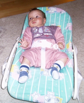| 25 april 2002 en Kyra ligt voor het eerst in haar wipstoel. | |||||||||||||||||